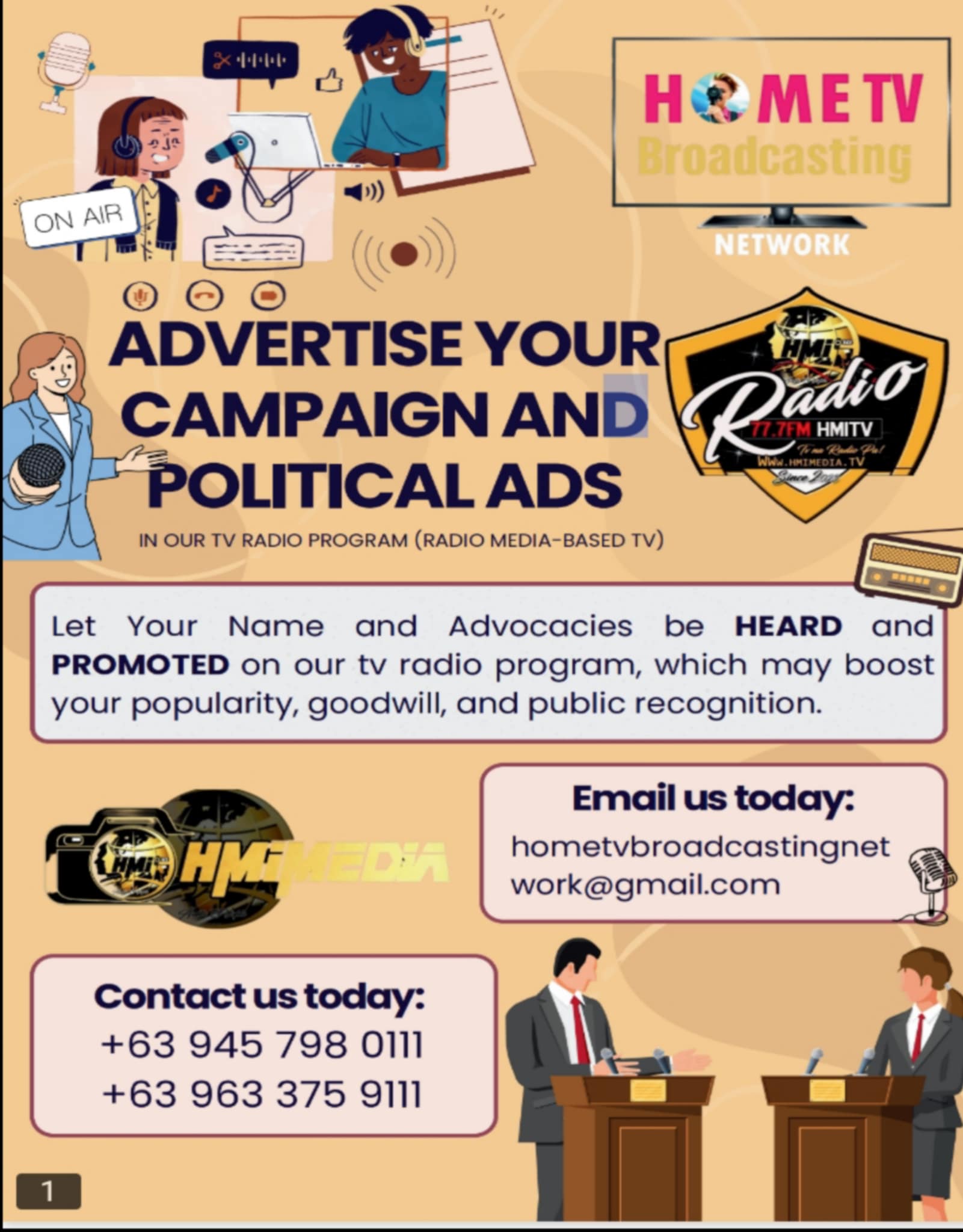 Learn more about our advertising options and view our media kit at Www.hmimedia.tv. Contact us at +639457980111 /+639633759111or [Email ] to Hometvbroadcastingnetwork@gmail.com to discuss how Home TV Broadcasting Network can help your business thrive.